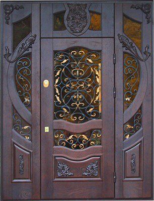 Поговорим об отделке. Вариантов декора дверей много. В большинстве случаев, для отделки элитных дверей используется массив натурального дерева или натуральный шпон с фрезеровкой. Цвет двери так же делается по желанию заказчика. Очень красиво и представительно выглядят двери с ковкой и стеклом.